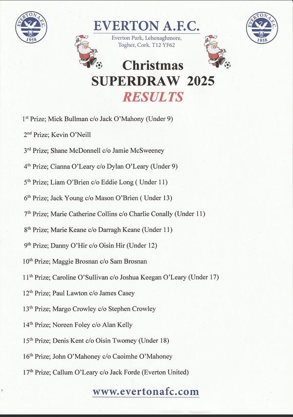Congratulations to all this years winners. Prizes are to be collected tomorrow evening from 7.30-8.30 pm in Everton Park. Thanks to all that supported this years draw ππ»ππͺπ