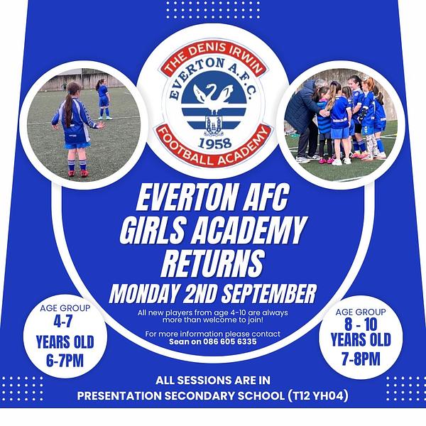 The Everton AFC Girls Academy returns on Monday 2nd of September. All new girls from the ages of 4-10 are most welcome. For further information please contact Sean Cotter on 086 6056335.