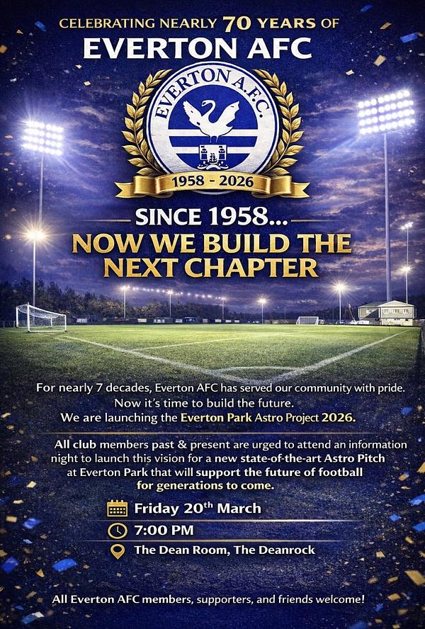 We are inviting all members, parents, sponsors, supporters and past players to join us for the official launch of the Everton AFC Astro Project. This is a hugely important moment for our club as we plan for the future and ensure Everton AFC continues to grow and thrive for the next generation.